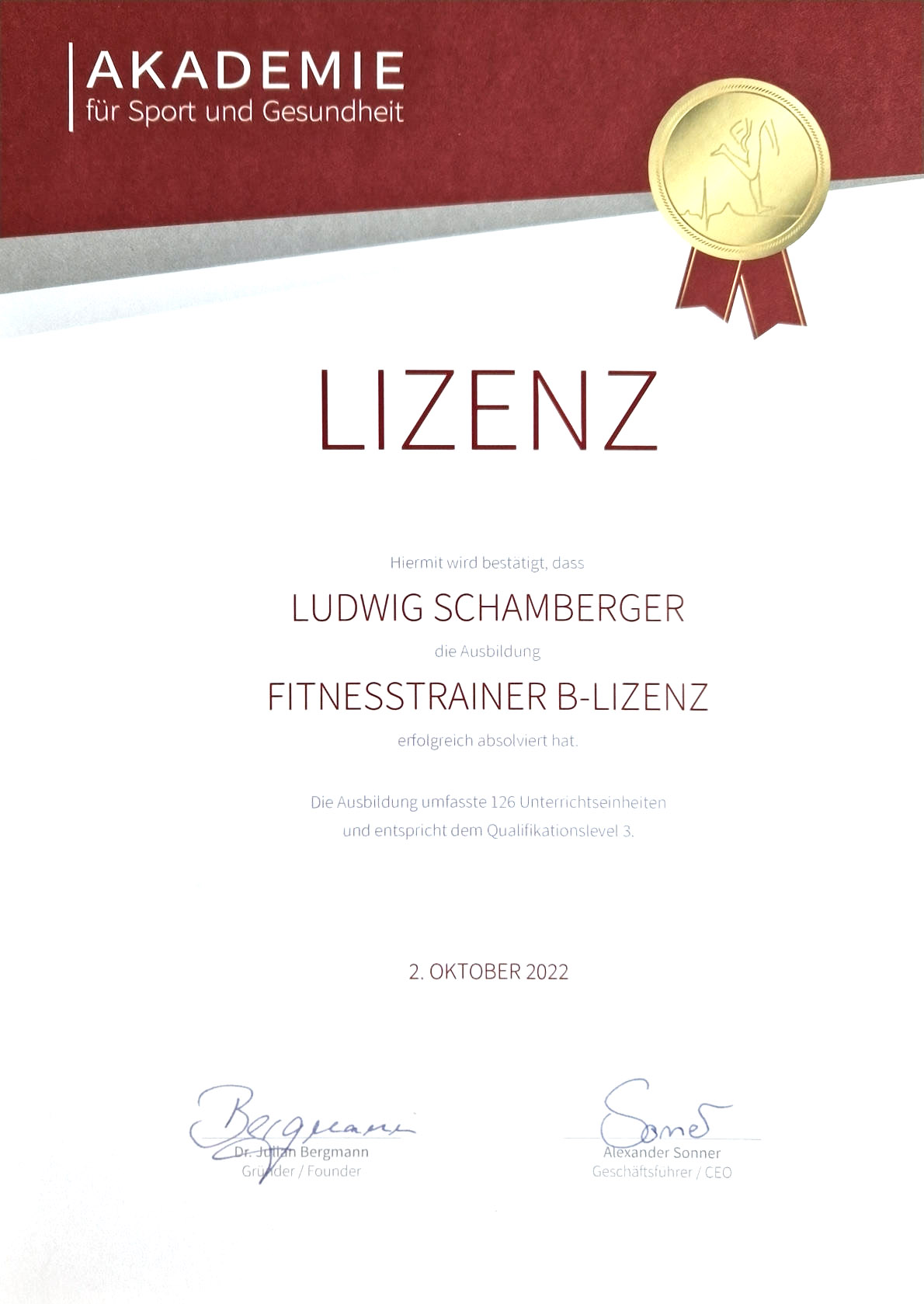 Als gelernter Schreiner und studierter Betriebswirt entschied ich mich daher, meinen Bürojob hinter mir zu lassen und mich ganz der Bewegung und der Unterstützung anderer zu widmen. 2022 absolvierte ich bei der Akademie für Sport und Gesundheit die Fitnesstrainer A-Lizenz (inkl. B-Lizenzen und medizinischem Fitnesstrainer), die dem Niveau einer 3-jährigen Ausbildung entspricht.